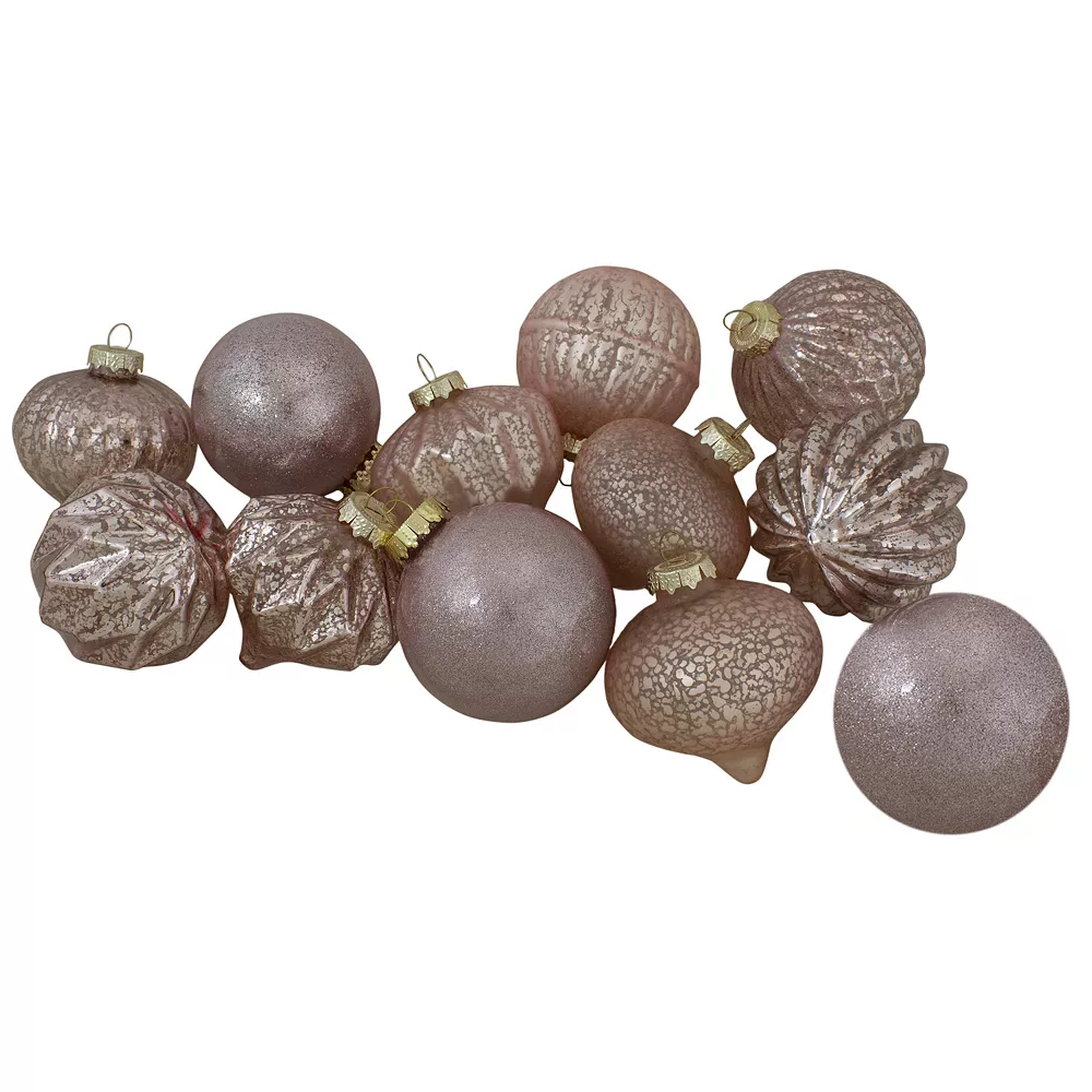 Add a touch of vintage flair to your holiday decor this Christmas season with this set of blush pink glass ornaments! Shades of pink are perfect to hang on your tree on wreaths or around your home. Created with various finishes and patterns this beautiful set is ready to compliment your home and Christmas decor with ease! Product Features: 12-piece set. Colors: blush pink. Finish: shiny matte glitter ribbed and faceted mercury glass. Hanging ball and onion finial ornaments. Ornaments are equipped with gold ornament caps (ornament hooks are not included). Dimensions: Balls: 3 diameter. Finials: 3.25 high x 3 diameter. Material(s): glass