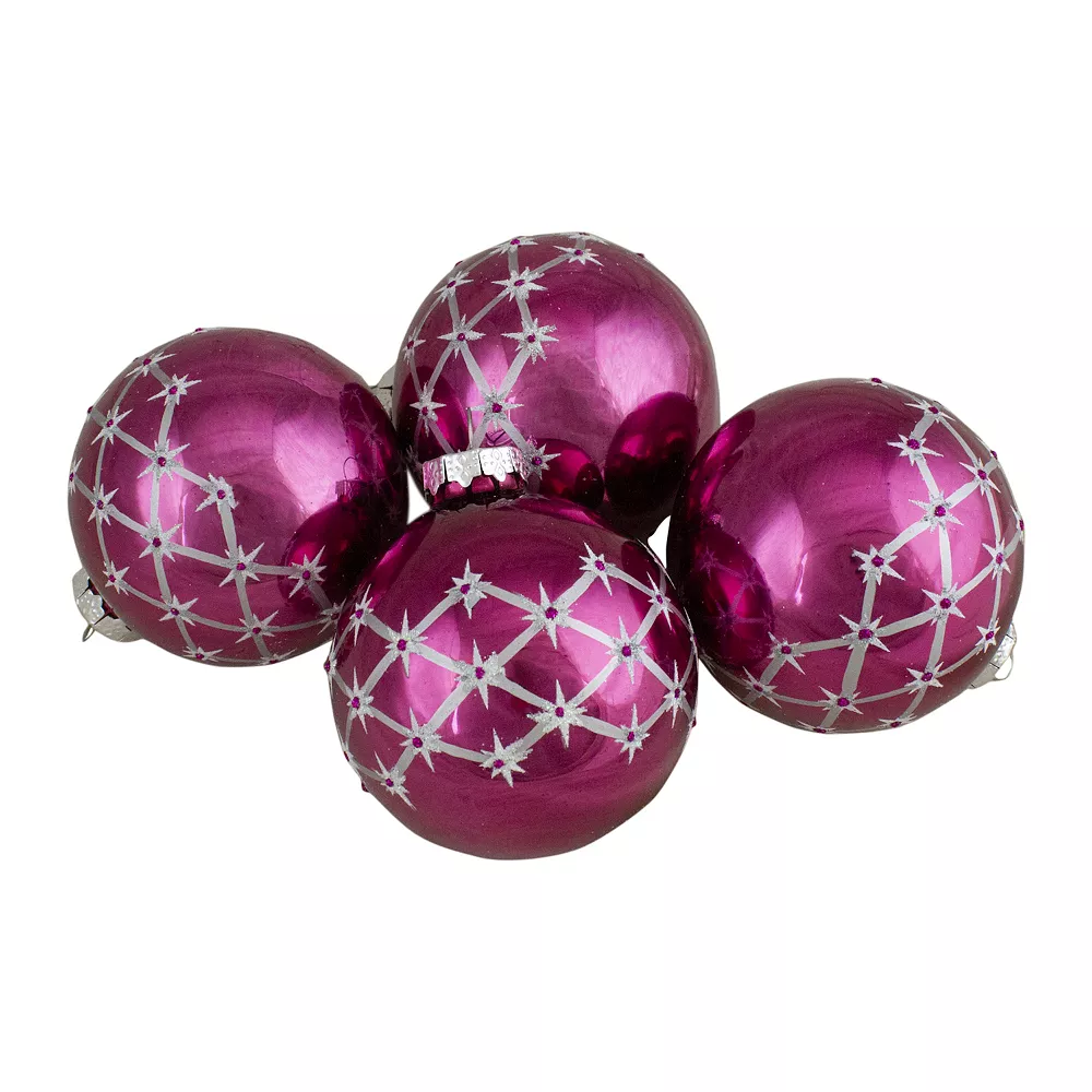 Create some cheery smiles this Christmas season with this set of pretty glass ball ornaments. The colorful shiny pink design will reflect the lights on your Christmas tree and dazzle the room! Add pops of pink to your tree around your home or on your wreaths. A beautiful set ready to complement your home and Christmas decor with ease. Product Features: 4-piece set. Color: pink. Finish: shiny. White criss-cross design around the ornament. Starburst design at the intersection of the criss-crosses; pink dot in the middle. Come with silver ornament caps; ornament hooks are not included. Dimensions: 3.25 in diameter. Material(s): glass/metal