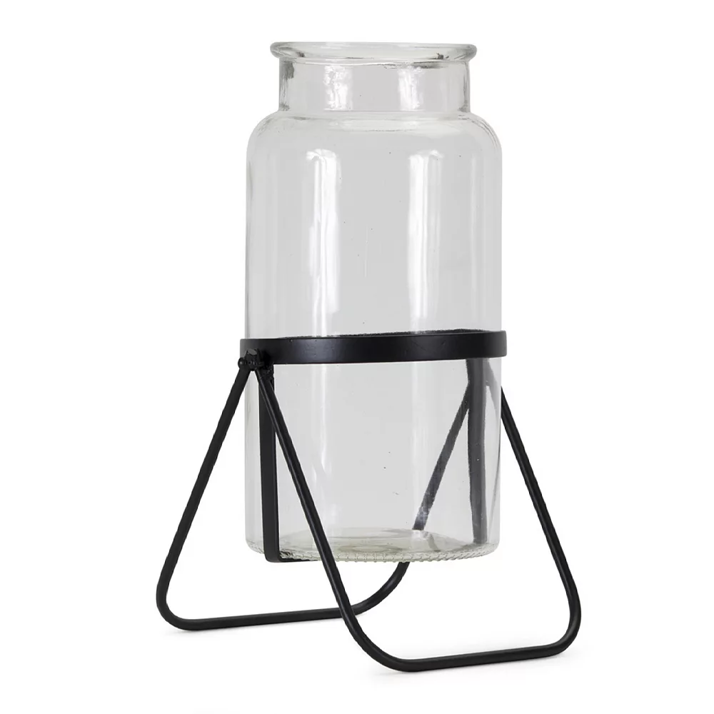 - Clear and black vase with metal stand