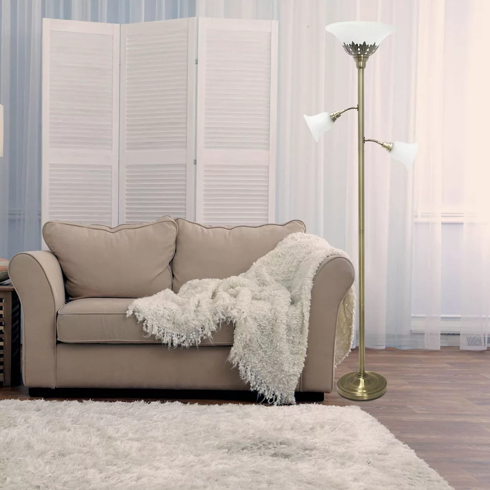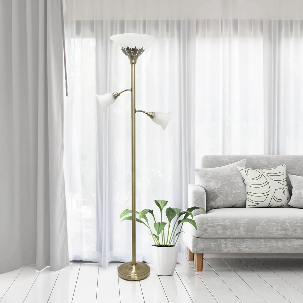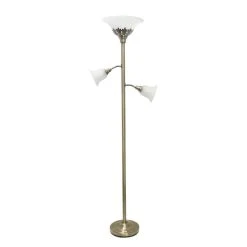 Light up your bedroom, office, foyer or living room with this elegant yet affordable 3 light floor lamp. It features a stunning antique brass finish and marbleized white shades with spiraled cut glass to complete the timeless look. Main Light Uses: 1 x 100W Medium Base Type A bulb (not included) Reading lights use: 2 x 60W Type a medium base bulbs (not included). Reading Lights Use: 2 x 60W Type A Medium Base Bulbs (not included). Dimensions: 13L x 21.5W x 71H Some Assembly Required. First Turn: Both reading lights will turn on. Second Turn: Main Light Only. Third Turn: All 3 lights on. Fourth Turn: All lights off. Switch Location: Lamp holder (controls all 3 lights, each click turns on until all are on). Height from Base to Socket/Shade: Top: 66. Middle: 55.5. Bottom: 49.5