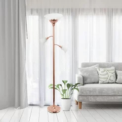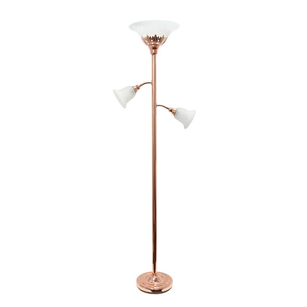 Light up your bedroom, office, foyer or living room with this elegant yet affordable 3 light floor lamp. It features a stunning rose gold finish and marbleized white shades with spiraled cut glass to complete the timeless look. Main Light Uses: 1 x 100W Medium Base Type A bulb (not included) Reading lights use: 2 x 60W Type a medium base bulbs (not included). Reading Lights Use: 2 x 60W Type A Medium Base Bulbs (not included). Dimensions: 13L x 21.5W x 71H Some Assembly Required. First Turn: Both reading lights will turn on. Second Turn: Main Light Only. Third Turn: All 3 lights on. Fourth Turn: All lights off. Switch Location: Lamp holder (controls all 3 lights, each click turns on until all are on). Height from Base to Socket/Shade: Top: 66. Middle: 55.5. Bottom: 49.5