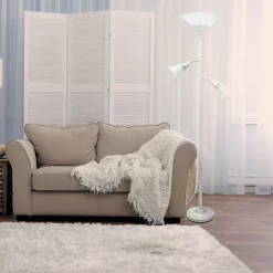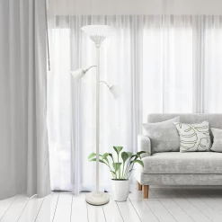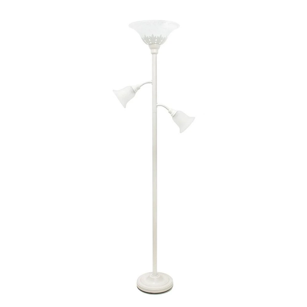 Light up your bedroom, office, foyer or living room with this elegant yet affordable 3 light floor lamp. It features a stunning white finish and marbleized white shades with spiraled cut glass to complete the timeless look. Main Light Uses: 1 x 100W Medium Base Type A bulb (not included) Reading lights use: 2 x 60W Type a medium base bulbs (not included). Reading Lights Use: 2 x 60W Type A Medium Base Bulbs (not included). Dimensions: 13L x 21.5W x 71H Some Assembly Required. First Turn: Both reading lights will turn on. Second Turn: Main Light Only. Third Turn: All 3 lights on. Fourth Turn: All lights off. Switch Location: Lamp holder (controls all 3 lights, each click turns on until all are on). Height from Base to Socket/Shade: Top: 66. Middle: 55.5. Bottom: 49.5