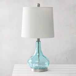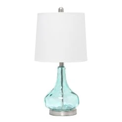 Beautify your home with this clear glass table lamp! Paired with a beautiful white fabric shade, its’ see through base bends alongside chrome accents combines simplicity and the right touch of color. If you’re seeking simplicity with a dash of uniqueness, this is the perfect lamp!