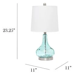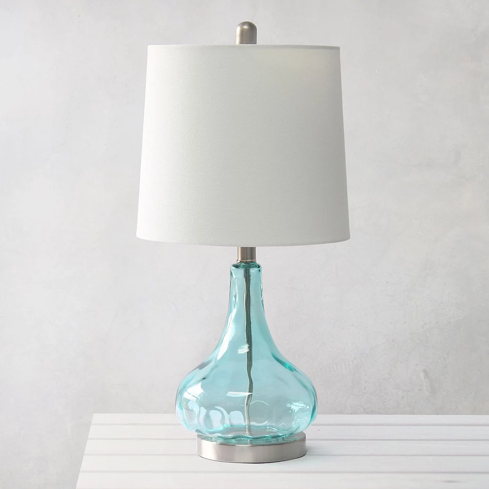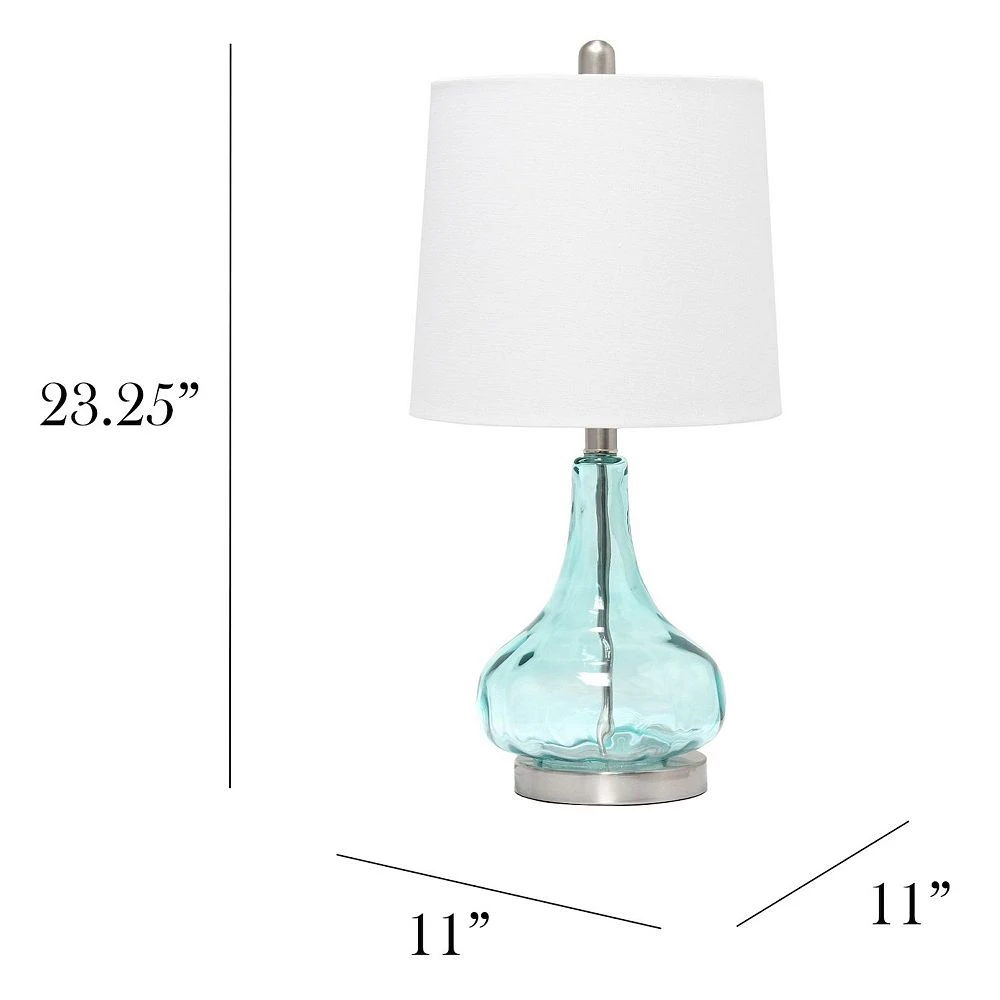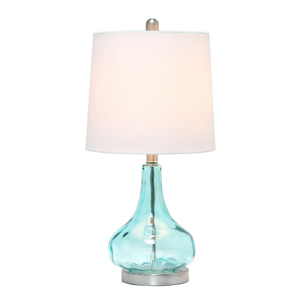 - Curvy clear blue glass base. White tapered fabric shade. Easily accessible rotary switch located on the socket