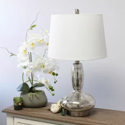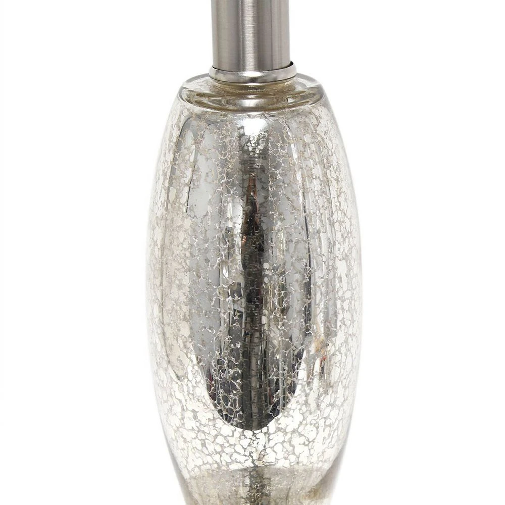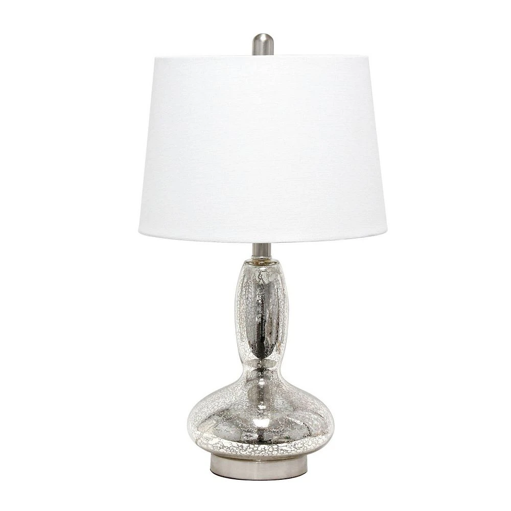 - Mercury glass base. White fabric shade. Style: Contemporary. Finish/Color: Mercury. Primary Material: Glass.