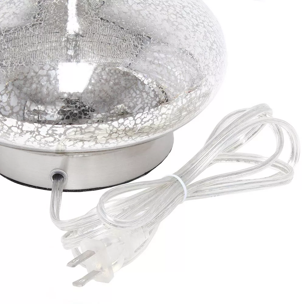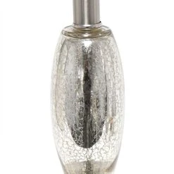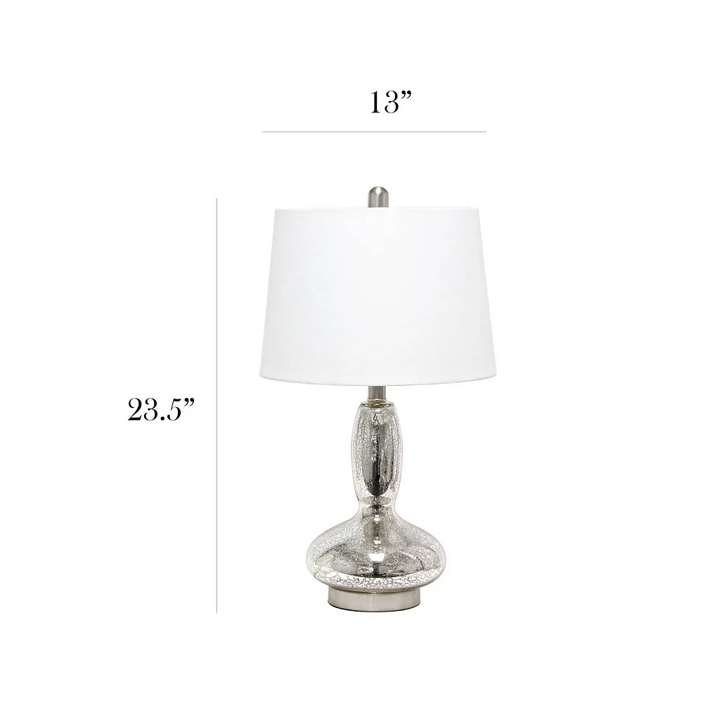Simple yet sleek, this table lamp will add the perfect touch of style to your home. With a smooth and contemporary shaped base in Mercury, this lamp offers a sophisticated feel to top off your night stand, living room, bedroom or office. Accented with brushed nickel and a white fabric shade, this is the perfect fit for your home decorating needs. Material Breakdown: 48%, Fabric, 48%, glass, 3%, metal, 1% plastic, Lamp measures D: 13 x 23.50