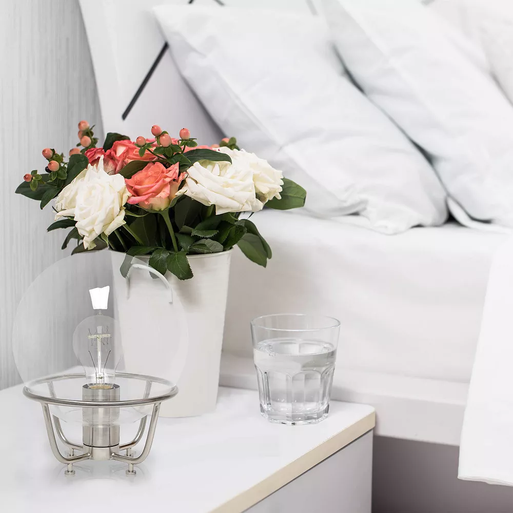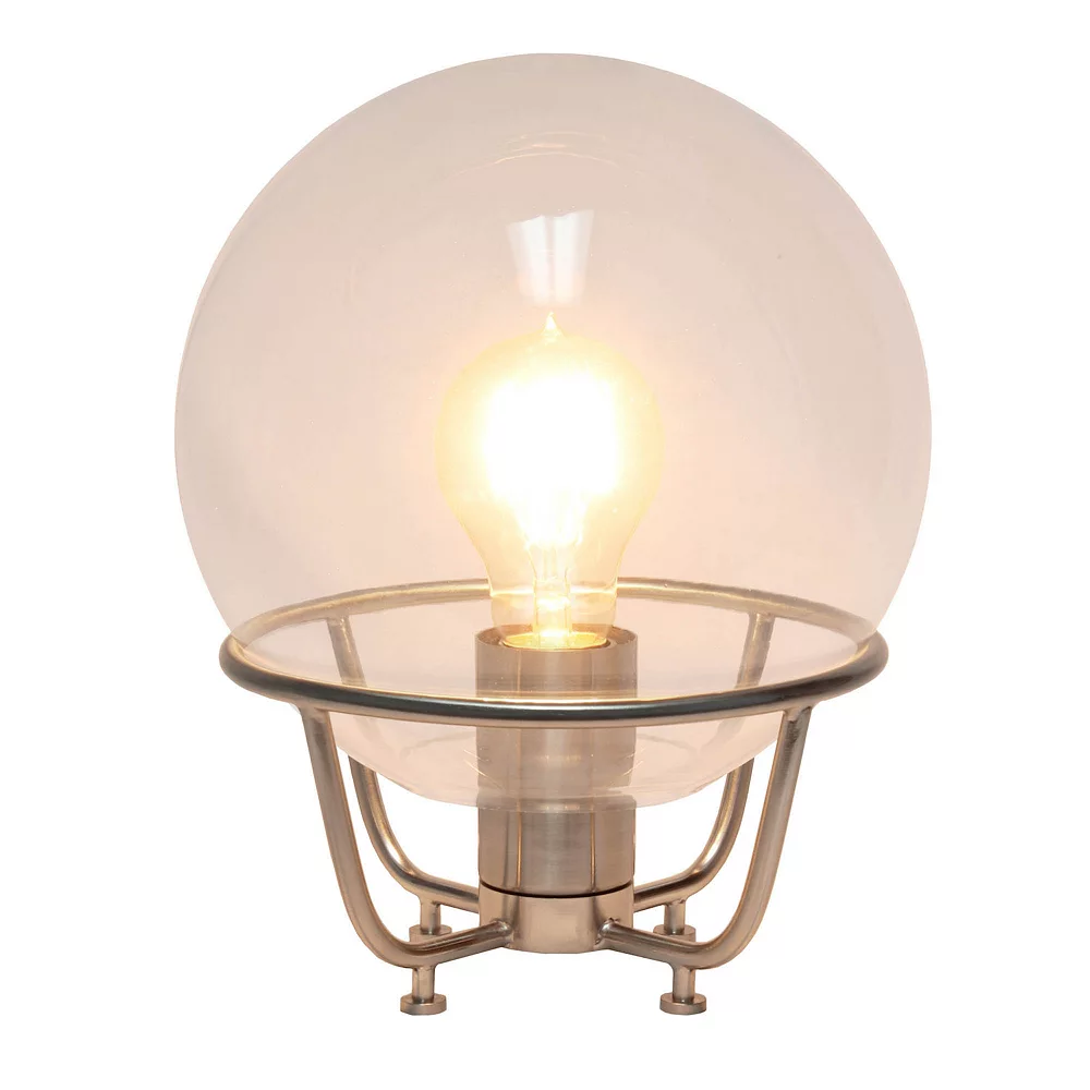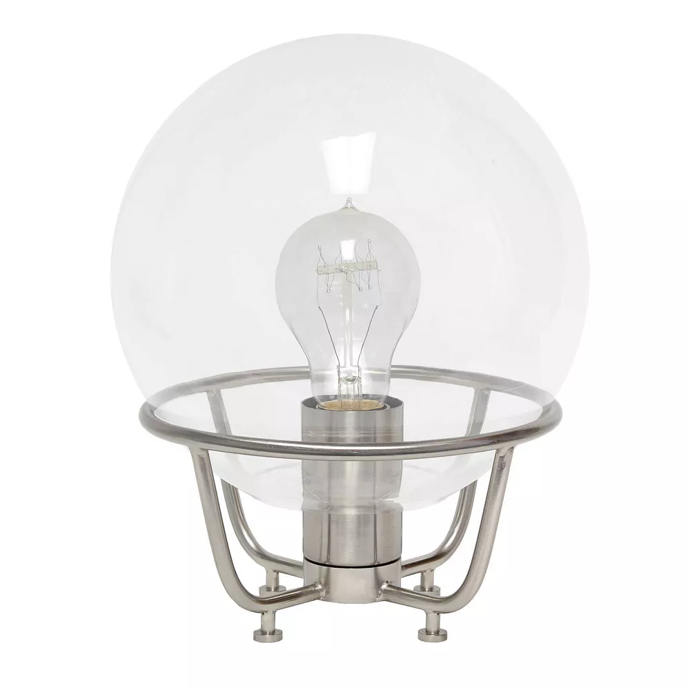 Accent any room in your home with this modern table lamp. Measuring 10 inches high, it’s the perfect solution to freshen up your nightstand, end table or foyer. The round clear glass shade is complimented by a brushed nickel metal base, the perfect combination for a sophisticated modern look. Brushed Nickel finish. Round clear glass shade. Easily accessible on/off switch on cord. Uses 1 x 40W medium type A base bulb (‘not included), Lamp measures: 7.75L x 7.75W x 10H