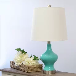 - Teal glass base. White fabric drum shade. Style: Contemporary. Finish/Color: Teal/Linen White. Primary Material: Glass