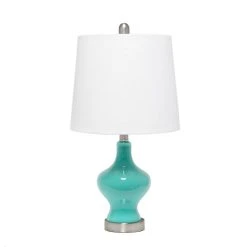 This contemporary glass table lamp features a teal base with brushed nickel accents and a white fabric drum shade. This lamp will add a refined touch to any space. Perfect for living room, bedroom, office, or anywhere you need to add fashion lighting. Material Breakdown: 48%, Fabric, 48%, glass, 3%, metal, 1% plastic, Lamp measures D: 12 x 22.5, Shade Bottom Opening: 12.Cord Length: 63.5.