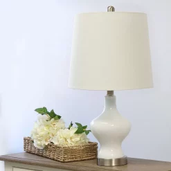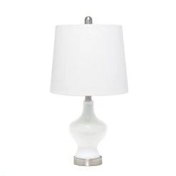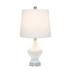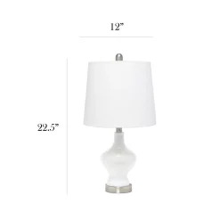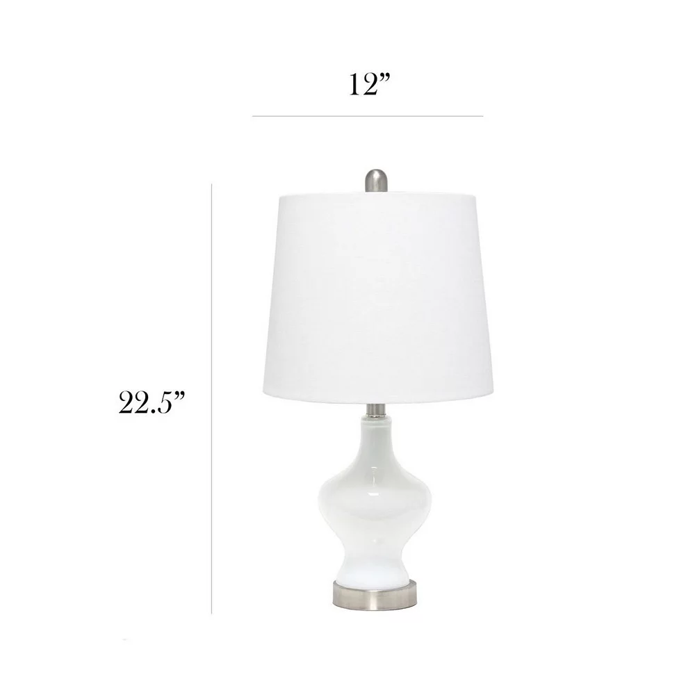 This contemporary glass table lamp features a white base with brushed nickel accents and a white fabric drum shade. This lamp will add a refined touch to any space. Perfect for living room, bedroom, office, or anywhere you need to add fashion lighting. Material Breakdown: 48%, Fabric, 48%, glass, 3%, metal, 1% plastic, Lamp measures D: 12 x 22.5