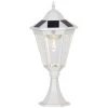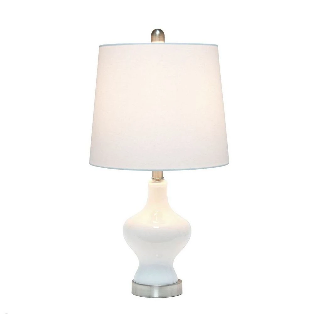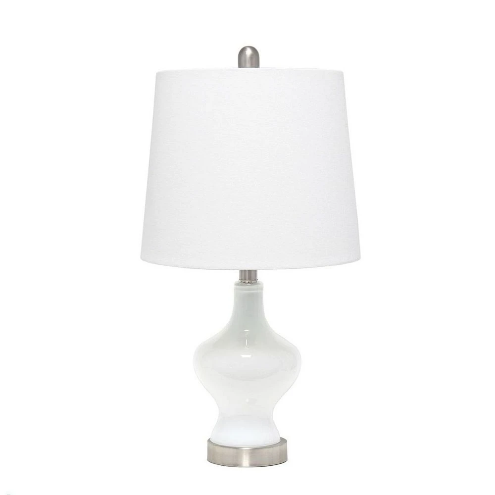 - White glass base. White fabric drum shade. Style: Contemporary. Finish/Color: White/Linen White. Primary Material: Glass. Shade Shape: Drum