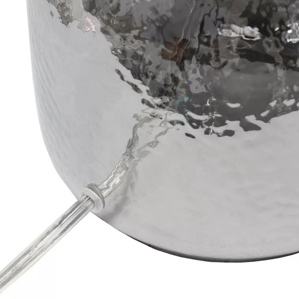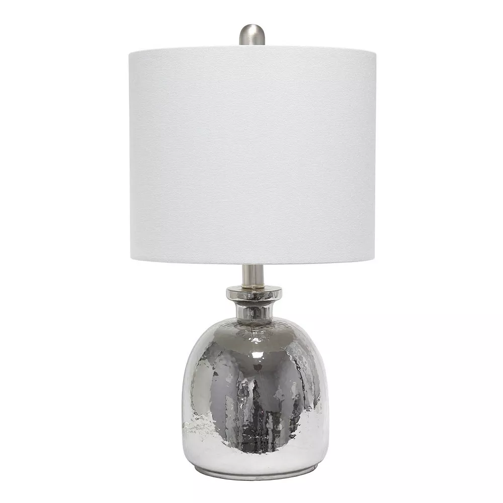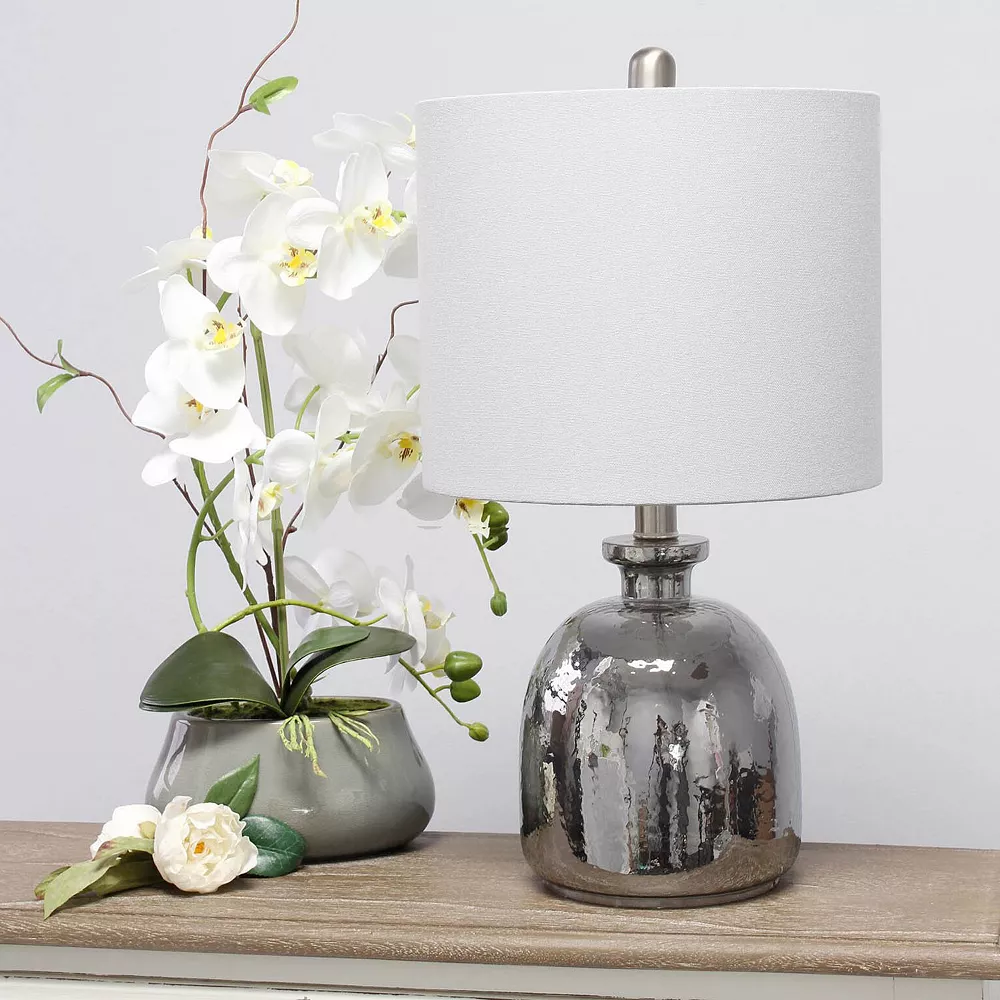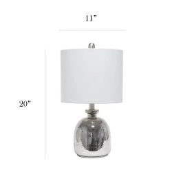 If you are looking to add a little modern flair to your home, this silvery glass table lamp with a light gray fabric shade is just what you need. This lovely table lamp is crafted with a textured glass base and open bottom, matched with a gray fabric drum shade. This table lamp is the perfect accent piece that will blend all of your contemporary decor to your pictureque vision. Material Breakdown: 48%, Fabric, 48%, glass, 3%, metal, 1% plastic, Lamp measures D: 11 x 20, Shade Security: Harp & Finial.