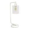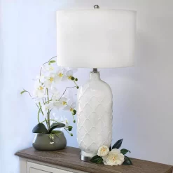 Add a contemporary feel to any room with this charming lamp. With its’ elegant and clean motif on its’ pure white base with brushed nickel accents, this lamp will add a touch of sophistication to your living space. Perfect for living room, bedroom, office, or anywhere you need to add a touch of style. Material Breakdown: 48%, Fabric, 48%, glass, 3%, metal, 1% plastic, Lamp measures D: 15 x 29.25