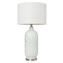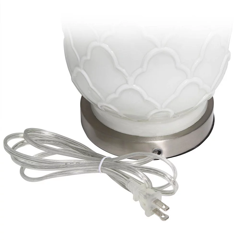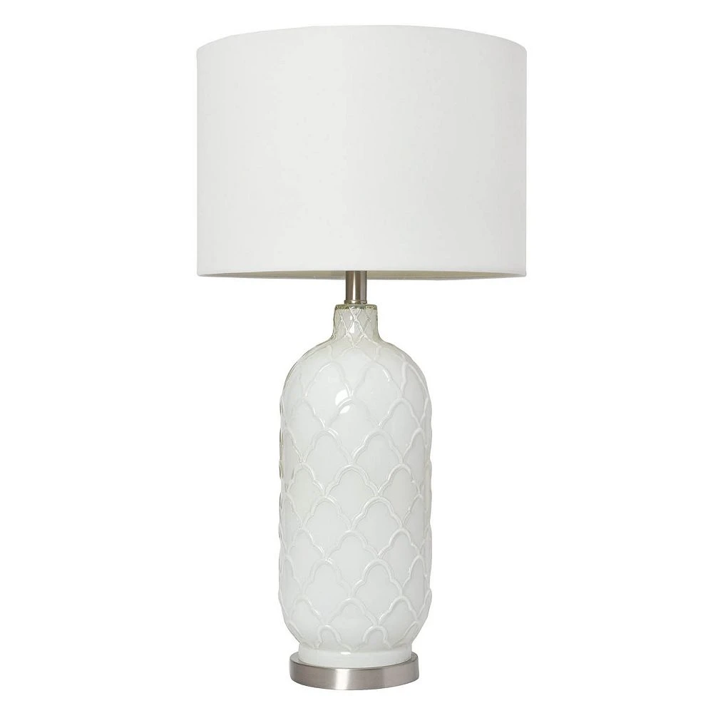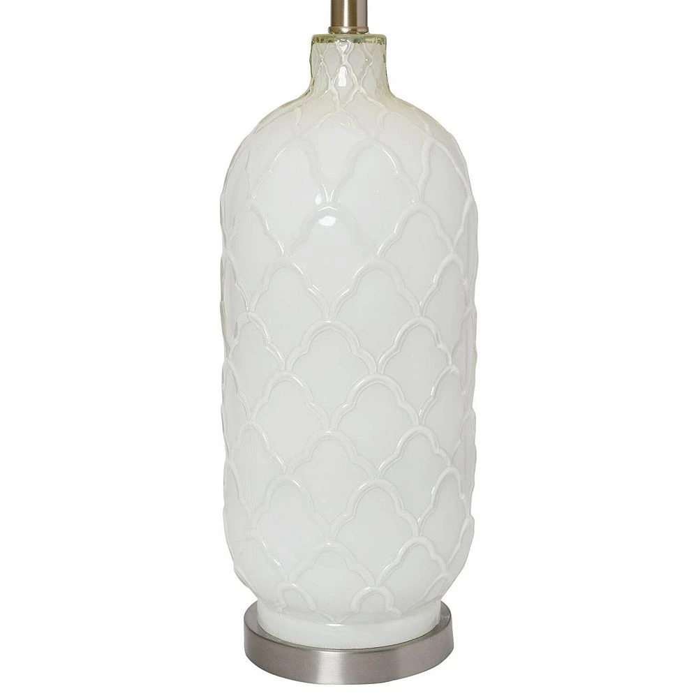 - White glass base with motif. White fabric drum shade. Style: Contemporary. Finish/Color: White. Primary Material: Glass. Cord Length: 60.5.