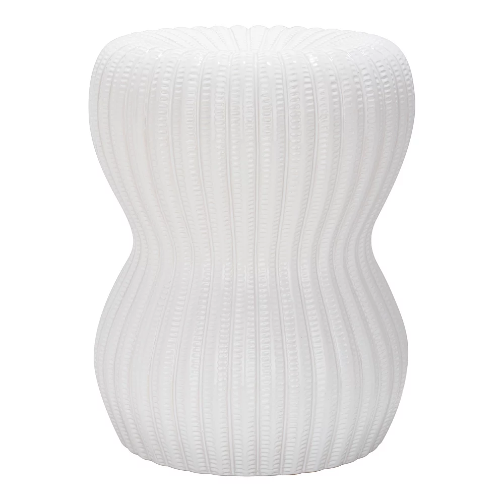 Sculptural beauty for the patio, garden, or living room, the Hour Glass Garden Stool is a study in serenity with its clean white glaze on textured ceramic. Use this charming piece by itself as an artistic accent or place several in a cluster for decorative drama indoors or out.