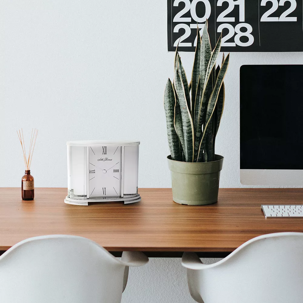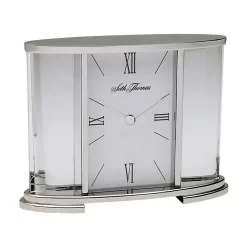 This is the perfect way to keep track of time on those busy days or to simply have a nice addition to your home or office desk. The sleek design would compliment the professional workspace. Enjoy great features such as a stamped dial and high polished finish. Dial (face) finished in white Hands finished in silver Silver primary color Made out of alloy and glass Combination of roman numeral and hour marker dial Carriage shape Stamped dial High polish and gloss Beautiful and elegant design 1AA Battery Required (not included) Dimensions: 4.75 H x 5.5 W x 1.25 D Item Dimensions: 4.75 x 5.50 x 1.25 Item Weight: 2.00lbs