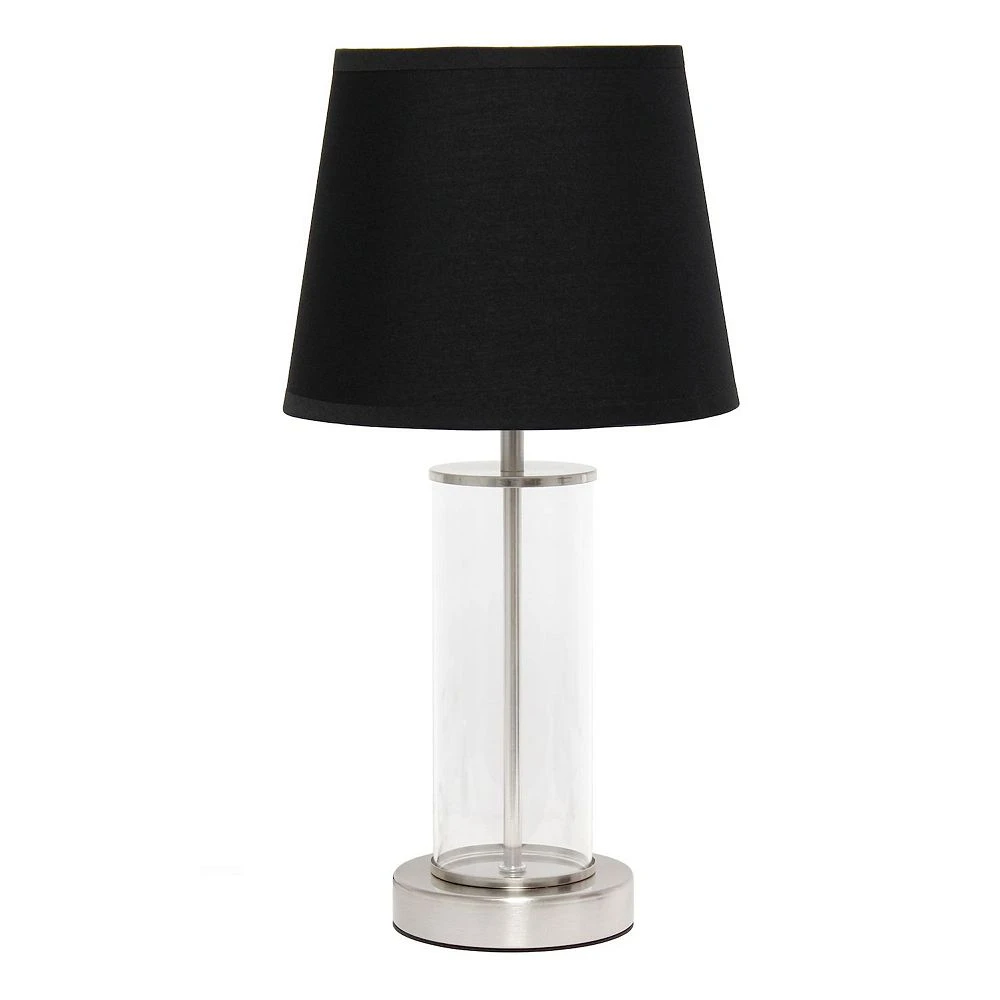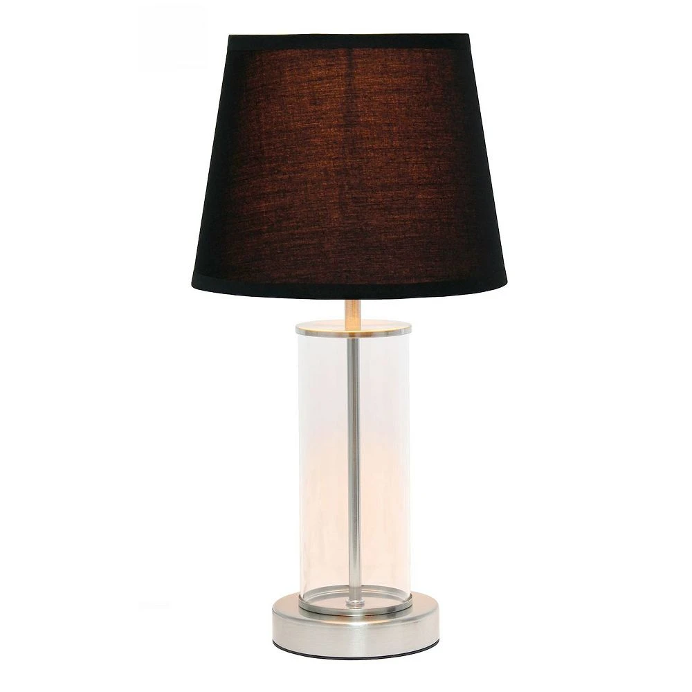 - Glass base with brushed nickel accents. Black fabric shade. Uses 1 x 60W type A medium based bulb (not included)