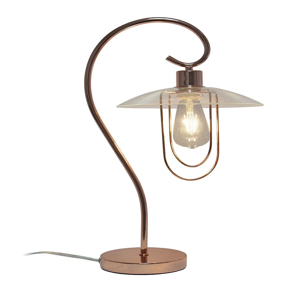 This modern table lamp features a curved metal base with a clear glass shade. Beautifully crafted in a vareity of finishes to choose from, this lamp will add a touch of elegance to any room in your home. Perfect for living room, bedroom, office, or anywhere you need to add fashion lighting. To get the complete industrial look, we recommend using a decorative Edison/Vintage bulb (not included).