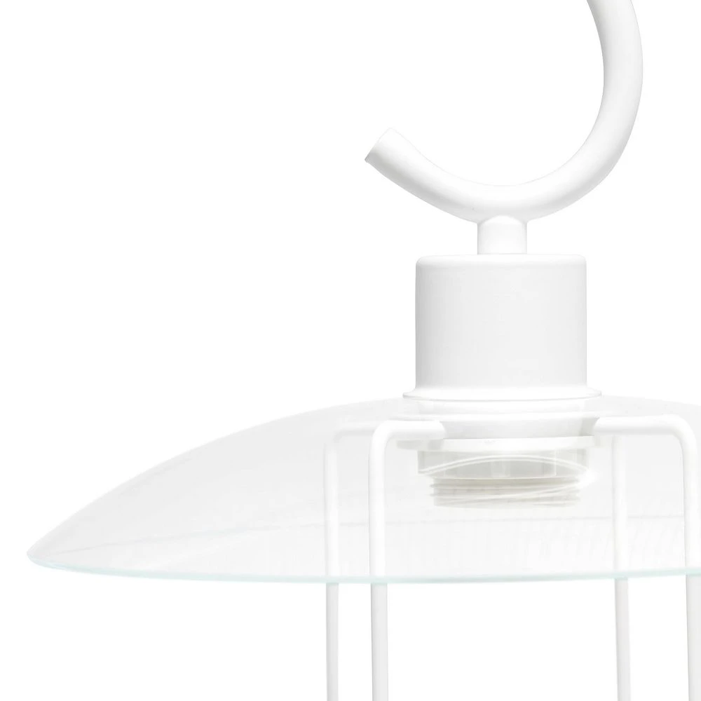 - White metal base. Clear glass shade. Easily accessible on/off switch located on the cord. Uses 1 x 40W medium type A base bulb (not included).