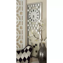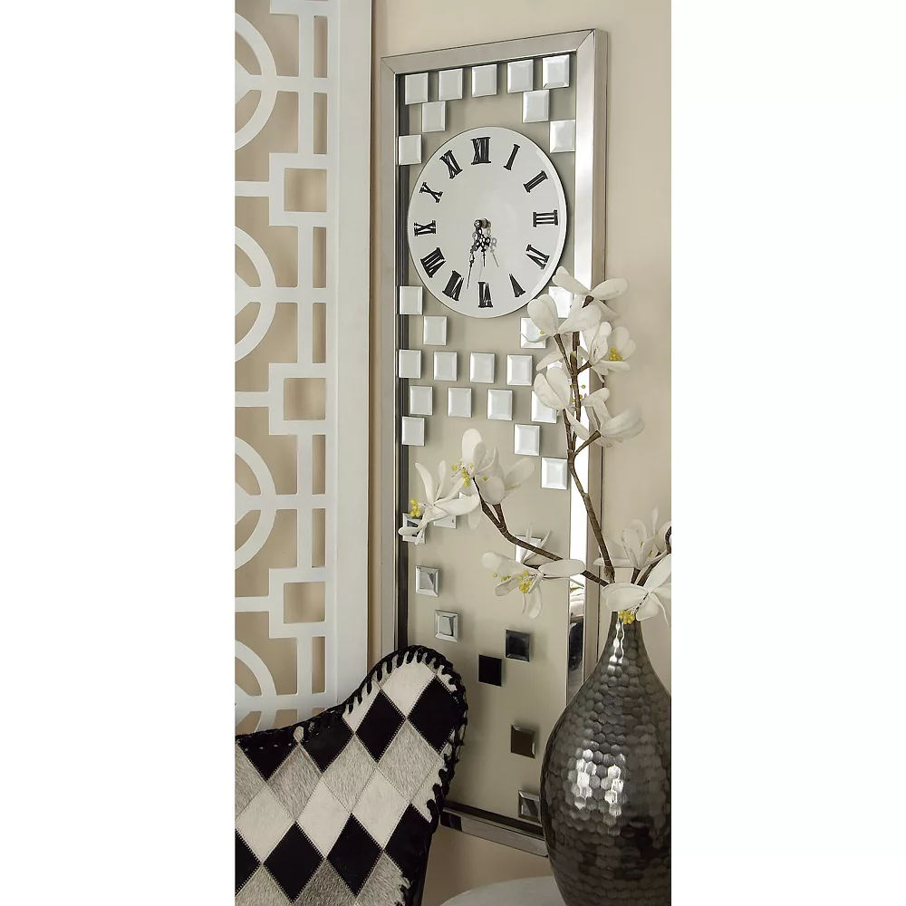 - Mirrored wall clock sports a textured silver finish that adds personality to any room