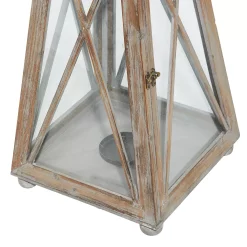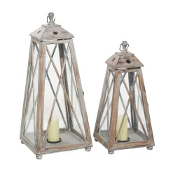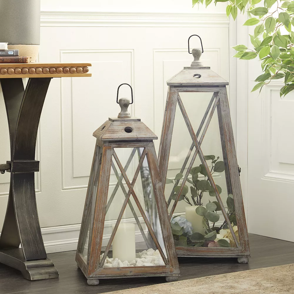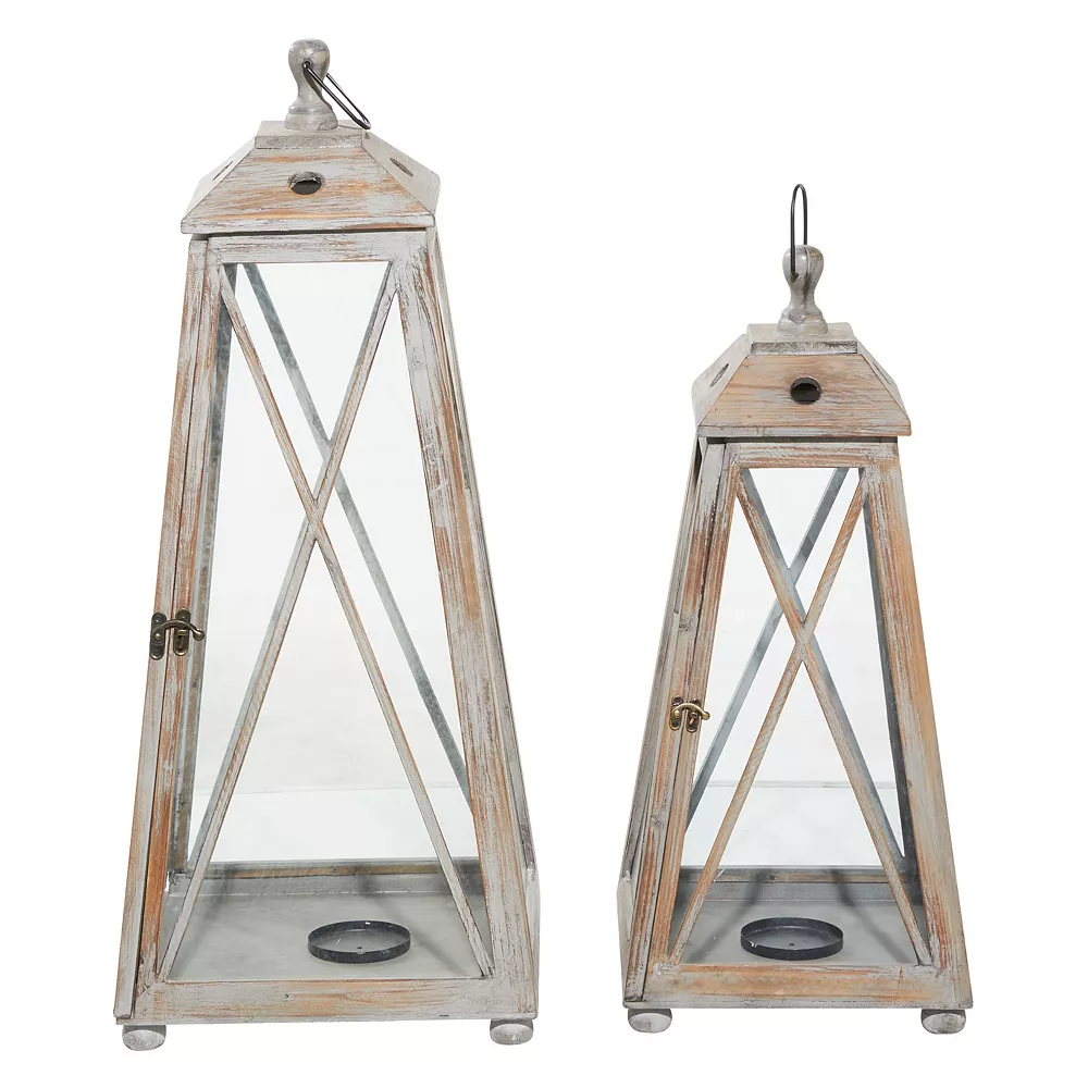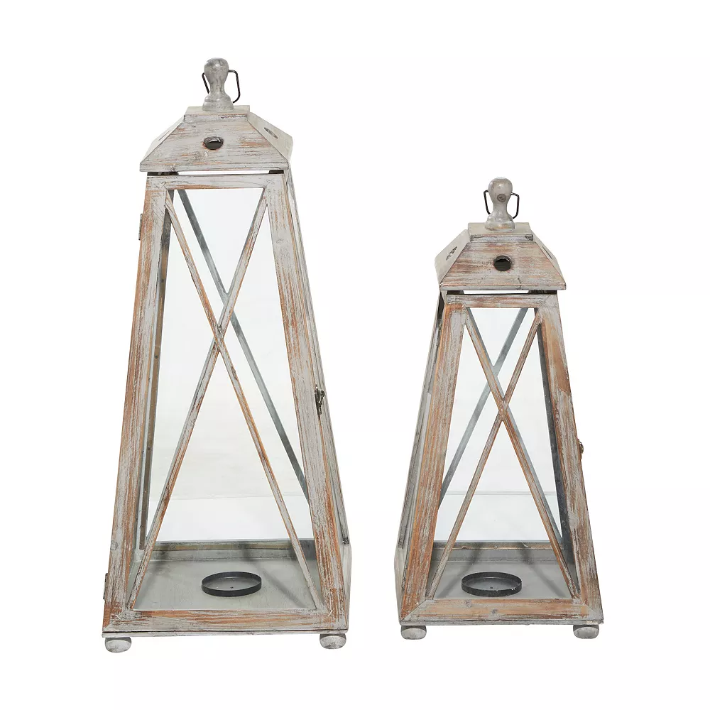 Add a stand-out accent to your living space with this Stella & Eve Tall Distressed Wood & White Finished Glass Lantern Set.