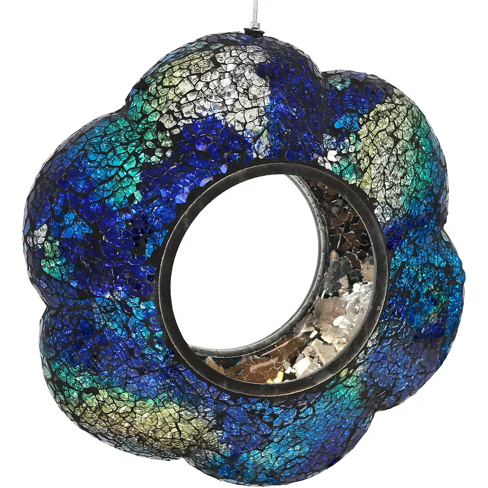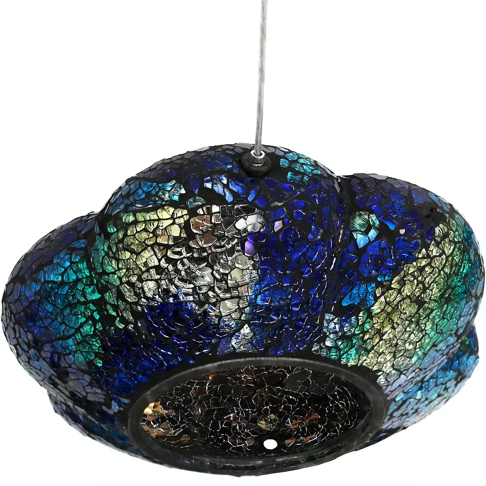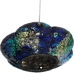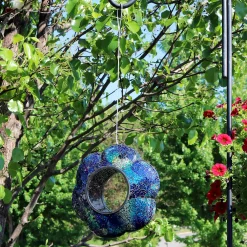 Give birds a colorful place to eat in the backyard or add an attractive decorative accent to the garden with this indigo, flower shaped, outdoor, hanging bird feeder. Made of glass, this feeder is in the shape of a flower with a beautiful, deep blue color, accented with speckles of turquoise and yellow. This feeder will effortlessly complement any natural or modern garden or outdoor setting. The 3 opening allows you to easily refill the bird seed and allows the birds to easily access and fly away from the seeds. This piece also comes with a 12 hanging wire to easily display this beautiful bird feeder on any ceiling, tree branch, or shepherd’s hook (not included) outdoors. There is also a drainage hole at the bottom to remove any excess moisture. Invite the local wildlife to your backyard! Remember to bring this feeder indoors during harsh weather conditions to better ensure longevity. This feeder can hold approximately 2 cups of bird seed.