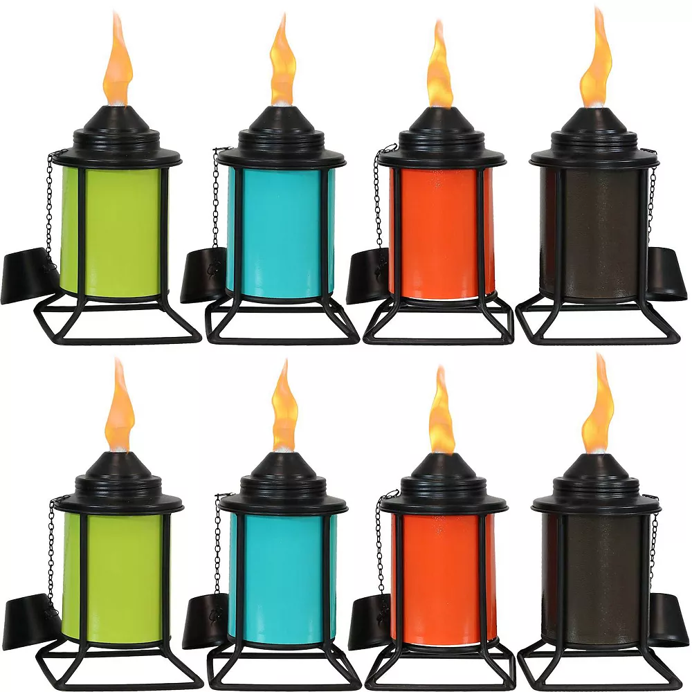 Add decorative yet functional outdoor lighting on any patio table with this set of 8 tabletop metal torches. The metal base adds protective and durable charm against the outdoor elements. Featuring torches in orange, blue, green, and brown, anyone can easily add a pop of color to a backyard oasis. They are a great addition to an outdoor dining space, side tables on the patio, beautifully distributed around the garden, or on the path towards the backyard campfire. Each torch features an attached snuffer, so the flames can be extinguished safely and easily. Since the snuffers are tethered to the torches with a chain, there’s no need to worry about searching for or losing the snuffers. Each torch also includes a long-lasting fiberglass wick to keep the flicker going all night long. Keep the friendly party or family gathering going throughout the evening and light up the night with unique fun.
