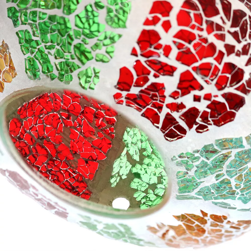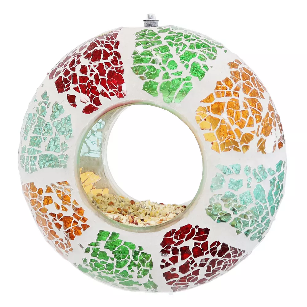 Add some sparkle to the patio, deck, yard, garden, or other outdoor landscaping area with this beautiful, summer inspired, mosaic bird feeder. It features red, blue, green, and orange mosaic glass in a summery, beach ball like design. This decorative piece will reflect all sorts of colorful vibrancy in your space as the sun reflects off the mosaic glass tiles. Even place this piece in the sun to keep your feathered friends warm! The 3 opening allows you to easily refill the bird seed and allows the birds to easily access and fly away from the seeds. This piece also comes with a 12 hanging wire to easily display this beautiful bird feeder on any ceiling, tree branch, or shepherd’s hook (not included) outdoors. There is also a drainage hole at the bottom to remove any excess moisture. Invite the local wildlife to your backyard! Remember to bring this feeder indoors during harsh weather conditions to ensure longevity.