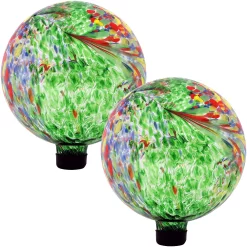 Add color and flair to any backyard or patio with this set of two green, artistic, outdoor, glass gazing ball globe. Beautifully made of glass, this gazing globe is mostly a bright, cheery green color with swirls of yellow, blue, and orange. It features a stemmed bottom with a rubber cap that protects the edges of the stem from vibrations from other objects or outdoor impacts. This design also makes it easier to place this gazing globe in a decorative stand (please note, a stand is not included with this piece of decor and must be purchased separately). Always store the gazing globe indoors before freezing or harsh weather occurs to better ensure its longevity. This gazing globe will make any patio, deck, garden, flower bed, yard, or other landscaping area attractive and colorful with its unique, paint-spatter design. This rich accent is sure to complement any modern or natural outdoor area and will add a vibrant pop of color anywhere.