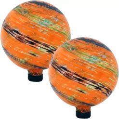 Enhance any backyard or patio with this set of two colorful, sunset sky inspired, outdoor, glass gazing ball globe. This outdoor decor piece is also a perfect addition to a garden bed or lawn. Made of glass, this gazing globe is crafted with attractive swirls of orange, green, blue and purple to mimic the sunset. It features a stemmed bottom with a rubber cap that protects the edges of the stem from vibrations from other objects or outdoor impacts. This design also makes it easier to place this gazing globe in a decorative stand (please note, a stand is not included with this piece of decor and must be purchased separately). Always store the gazing globe indoors before freezing or harsh weather occurs to better ensure its longevity. This gazing globe will make any patio, deck, garden, flower bed, yard, or other landscaping area attractive and colorful with its unique, vibrant, and striped design.