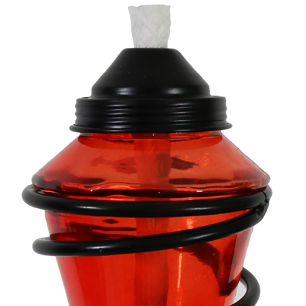 This set of 2 torches features beautiful, colored glass fuel containers that are attractively illuminated by torch light. The torches are surrounded by a metal casing that swirls elegantly for a contemporary or modern look to your backyard or other outdoor setting. Plus, this set of torches includes two fiberglass wicks that burn longer than regular wicks so you can keep the night conversations going effortlessly. The fuel containers can be filled with torch or bio ethanol fuel (please note, this set of torches does not come with fuel; fuel must be purchased separately). Safely extinguish the flame on each torch with the included snuffers which are conveniently attached to each torch by a chain. The set also includes ground stakes and deck clamps providing the option to use them in the yard or on the deck rails. The stakes also ensure that these torches will never blow away or easily fall in harsh weather.
