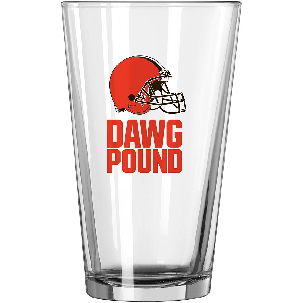 Enjoy your favorite game day beverage from this Slogan pint glass. Designed with classic Cleveland Browns graphics, it holds up to 16oz. of your drink. Proudly raise this glass every time the Cleveland Browns score.