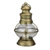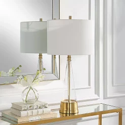 - Contemporary style table lamp features a cone shaped, glass base that sits atop an antique brass metal foot
