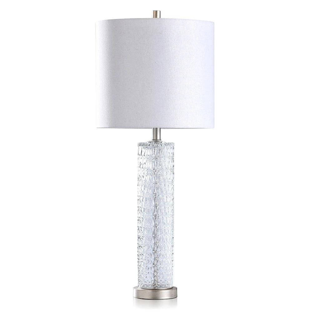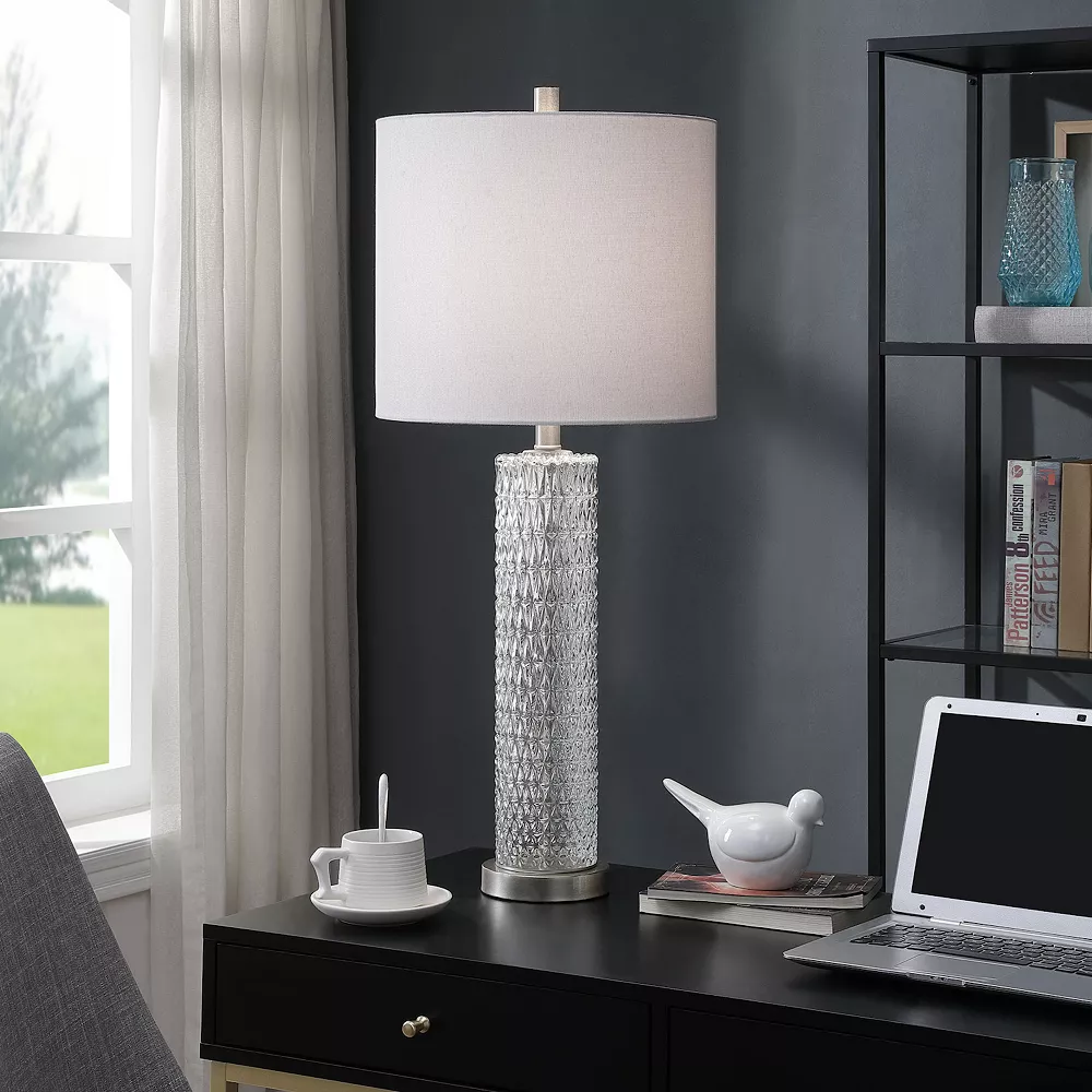 Instantly refresh your space with this Diamond Textured Glass Table Lamp with Brushed Steel Base.