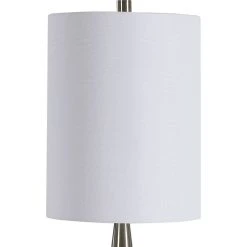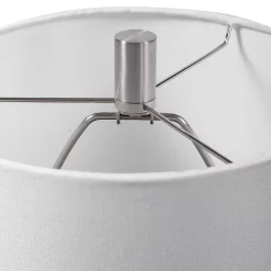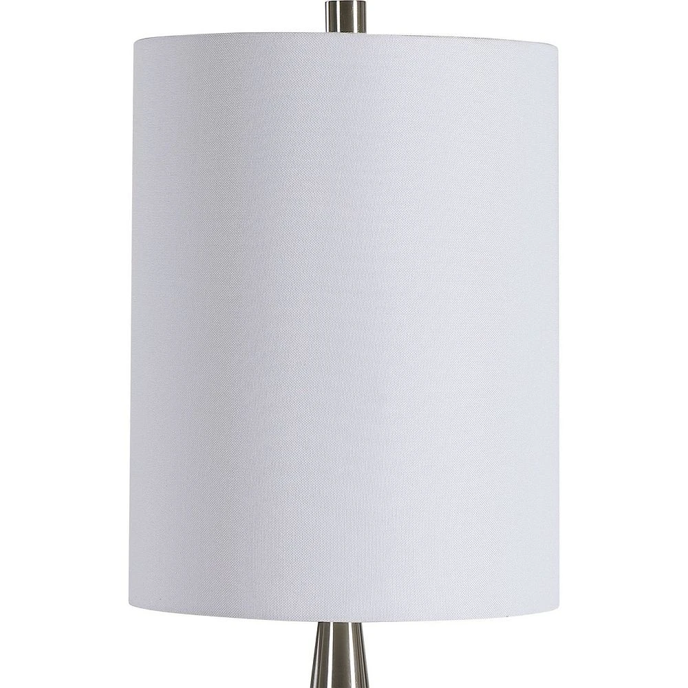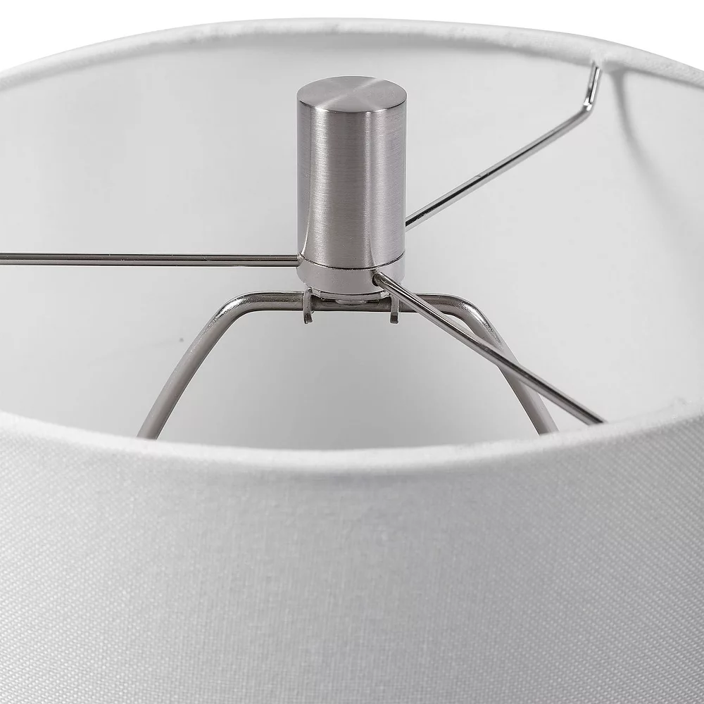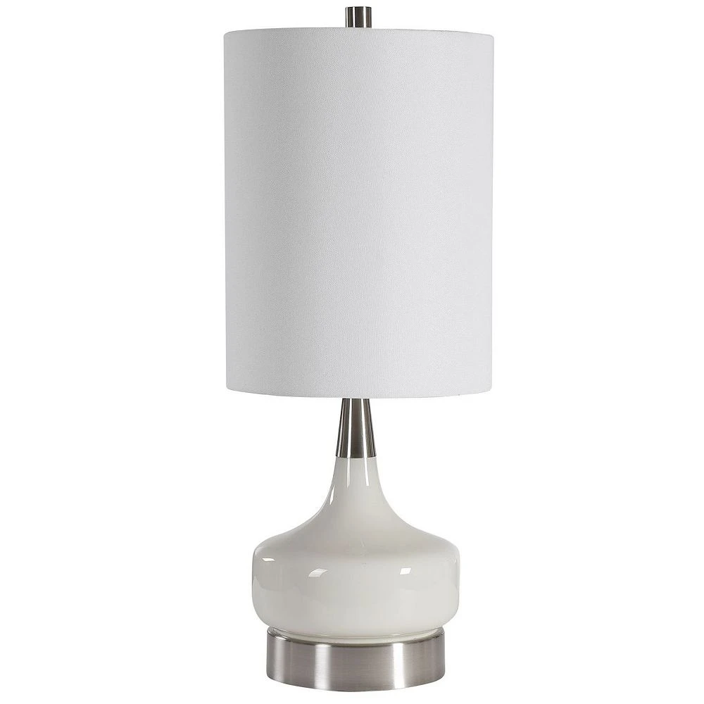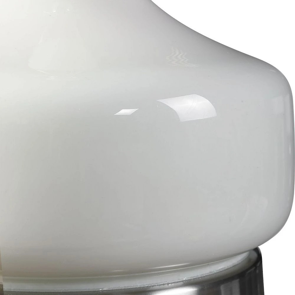 - White glass base adds to simplicity of table lamp, which is accented with brushed nickel plated details