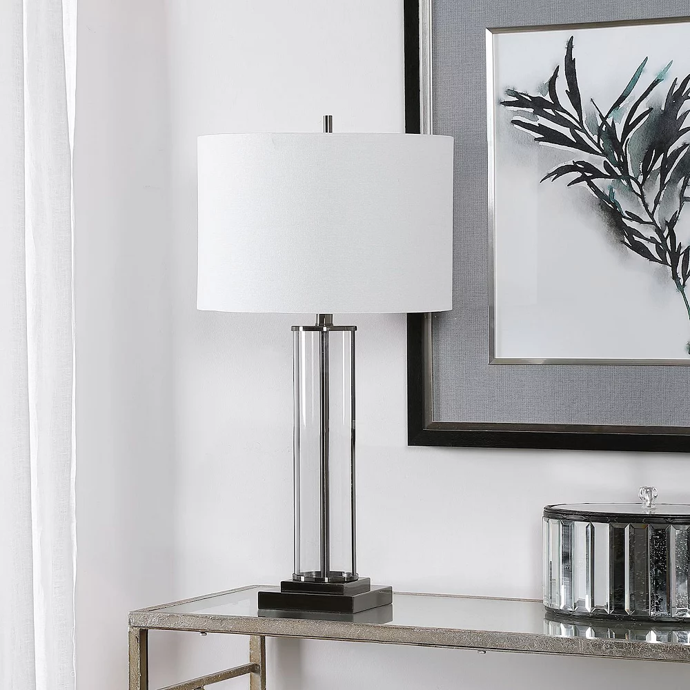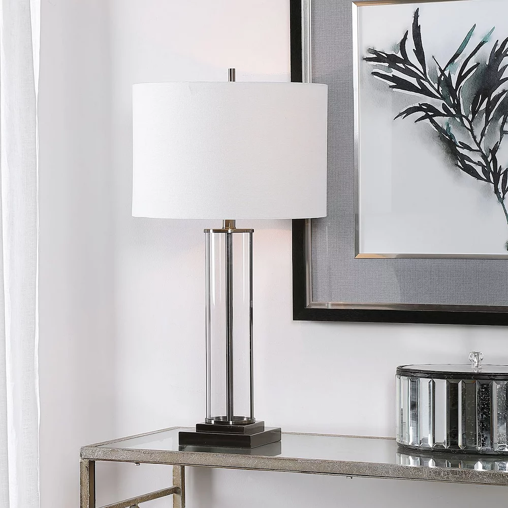 Create an eye-catching focal point in any room with this glass cylinder table lamp.